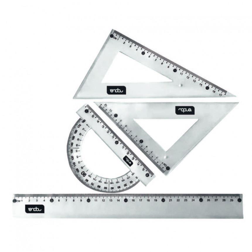 O kit contém: régua 30 cm, esquadro 45º, esquadro 60º, transferidor 180 graus com escala de graus.