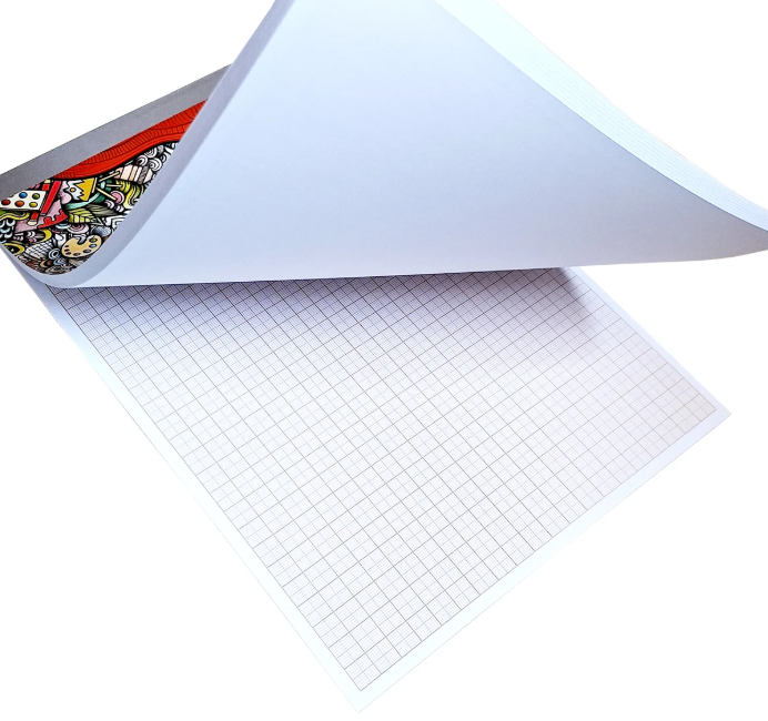 Bloco de desenho milimetrado, formato A4 (210x297mm), com 40 folhas em papel offset 90g/m² branco, com grade milimetrada em tom alaranjado.