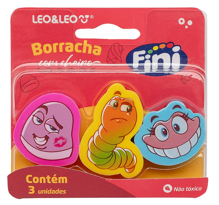 Ela possui formato dos personagens Fini, com estampa exclusivas e fragrâncias agradáveis. A qualidade de apagamento é ótima, permitindo uma remoção eficiente de traços de lápis sem danificar o papel. A borracha é macia ao toque e desliza suavemente sobre a superfície, sendo bem confortável, ideal para uso na escola, no escritório.