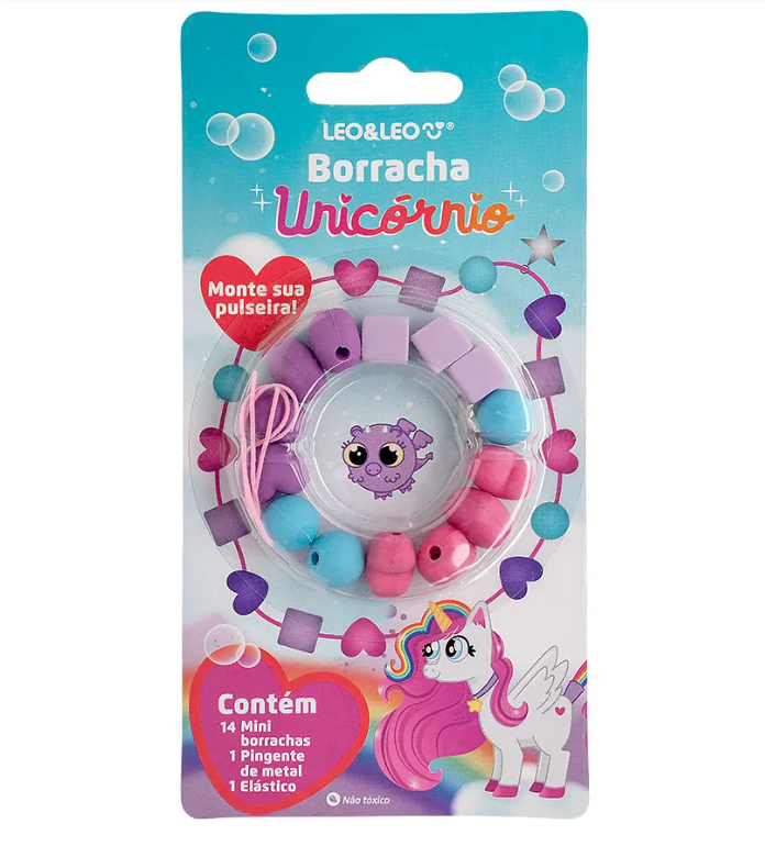 Com a Borracha Monte Sua Pulseira Unicórnio - Blister com 14 Borrachas 1 Elástico e 1 Pingente Leo&Leo a criança vai muito além do que só apagar algo: ela vai ter sua criatividade muito estimulada.